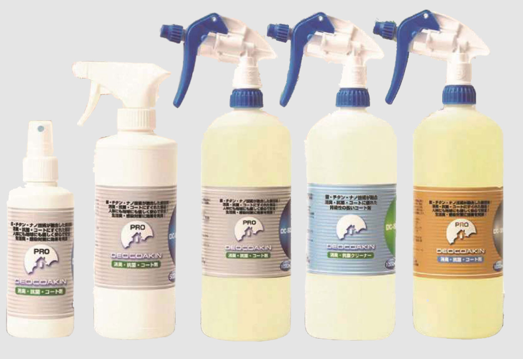 デオコーキンの主原料である銀系酸化チタンは酸化チタンと銀を超微粒子化(5ナノメートル)したものですので、従来の光触媒コーティングで使用されているバインターと呼ばれる接着剤なしで施工面に定着することができます。